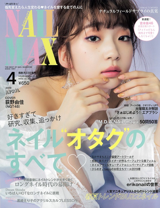 041p 「裏技ネイルグッズ9選」にフリーチャートの活用法を紹介 094p「NAIL GOODS PRESS」、122p 「News topics」および 126p 「SPECIAL PRESENT」にて Humming Colour (カルジェルカラージェル クラシックグレー (CGNG06S) / ビバーチェピンク (CGPI15S) / メロディーイエロー(CGYE05S) / トーンブルー (CGBL11S) / ラルゴブルー (CGBL12S) を掲載