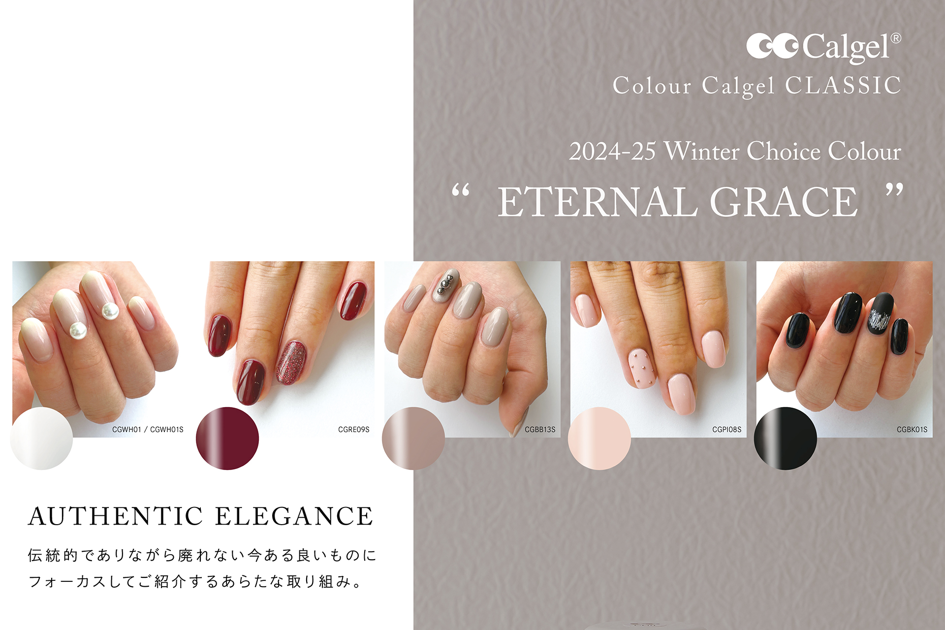 肌なじみの良い上品なライトグレージュ(CGBB13S)と深みのあるガーネットレッド(CGRE09S)、高級感のあるクラシックブラック(CGBK01S)が冬の指先を上品に魅せます。