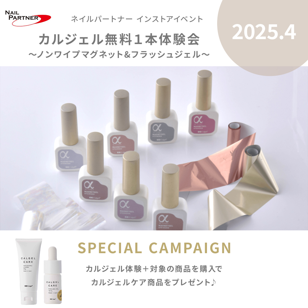 今回の体験会では、2024年5月にカルジェルから登場したカルジェル コードレスネイルマシンによるケア体験、11月25日発売の新色12C 3in1ジェルポリッシュによる時短施術やカルジェルのアルファバイカルジェルシリーズより新登場したフラッシュジェルの体験もできます。さらに当日は会場限定キャンペーンも♪たくさんの方のご来場をお待ちしております。
